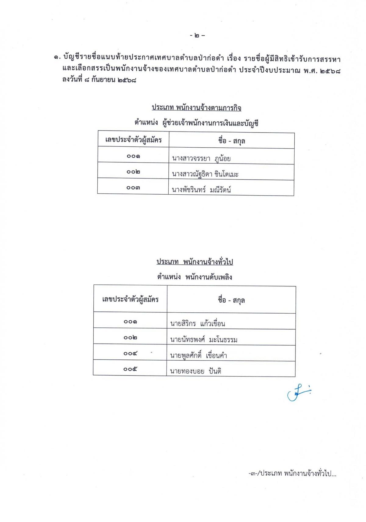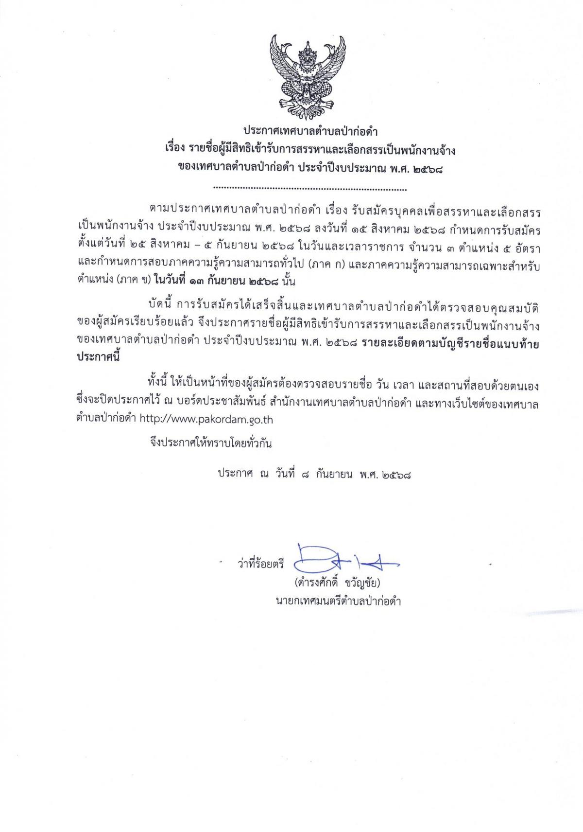 ประกาศเทศบาลตำบลป่าก่อดำ เรื่อง รายชื่อผู้มีสิทธิเข้ารับการสรรหา และเลือกสรรเป้นพนักงานจ้าง ของเทศบาลตำบลป่าก่อดำ ประจำปีงบประมาณ พ.ศ.2568